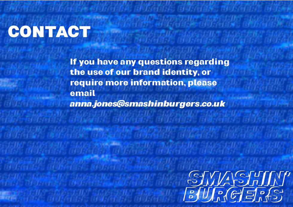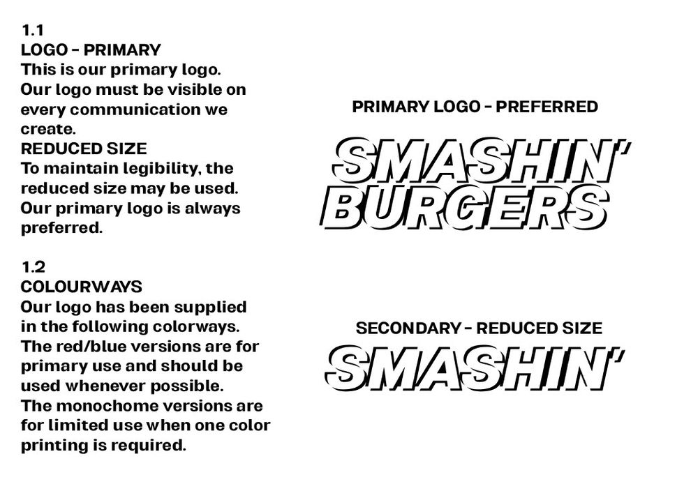This is the brand guidelines for smashin' burgers. It contains all of the relevant information on the graphics and visual applications of our brand. This includes guides on suitable usage of our logo and the proper colour ways including hex codes. Our iconic colour palette is showcased, same for the brand typography, Biggan Pro.